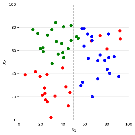 graph TD A[Root Node<br>x₁ ≤ 50?] -->|Yes| B[x₂ ≤ 50?] A -->|No| C[Class: Blue] B -->|Yes| D[Class: Red] B -->|No| E[Class: Green] classDef default font-family:Arial,font-size:14px; classDef redClass fill:#ffcccc,stroke:#ff0000,color:#cc0000,font-family:Arial; classDef greenClass fill:#ccffcc,stroke:#00cc00,color:#006600,font-family:Arial; classDef blueClass fill:#ccccff,stroke:#0000ff,color:#0000cc,font-family:Arial; class D redClass; class E greenClass; class C blueClass;