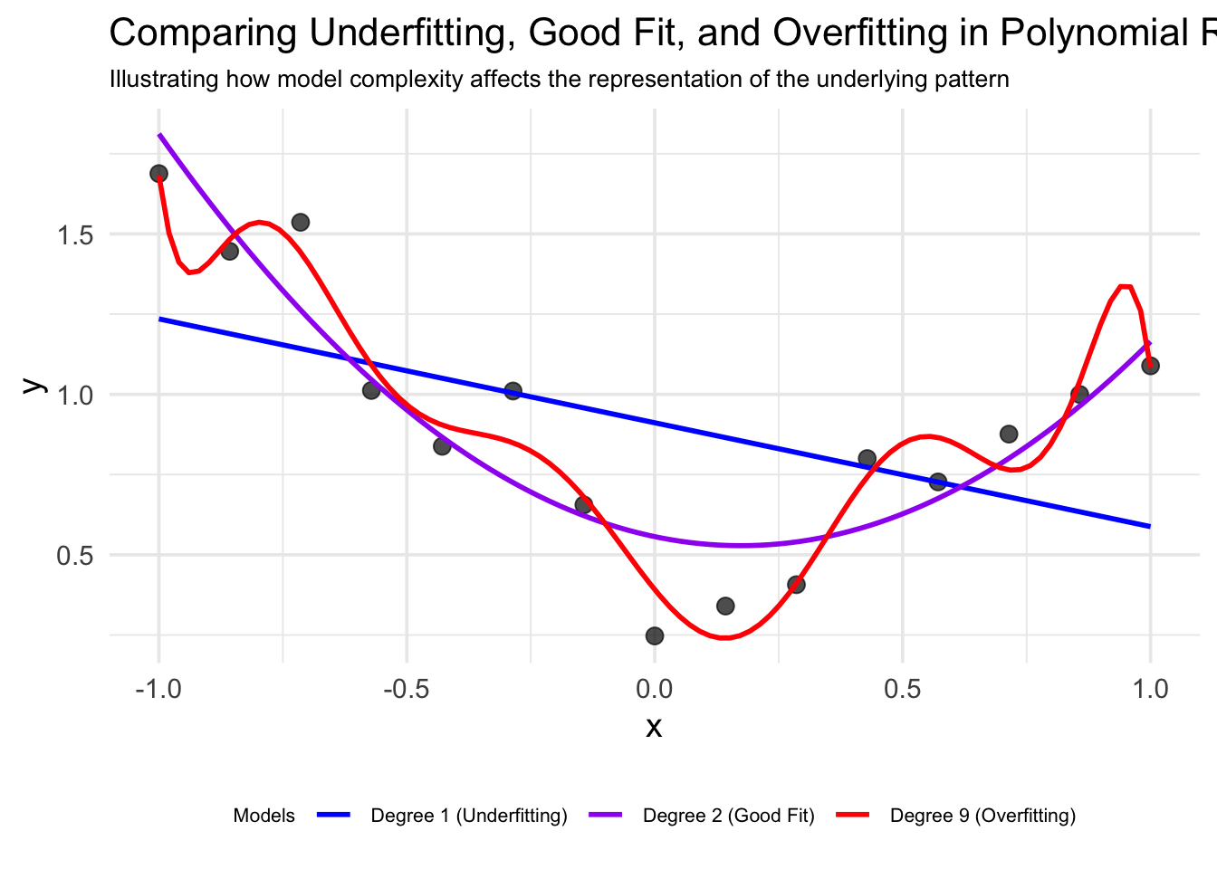 In this visualization, we’ll see how polynomials of different degrees fit a dataset generated from a true quadratic function with some added noise: